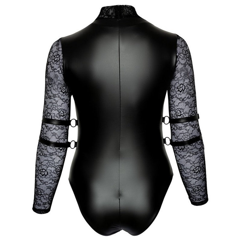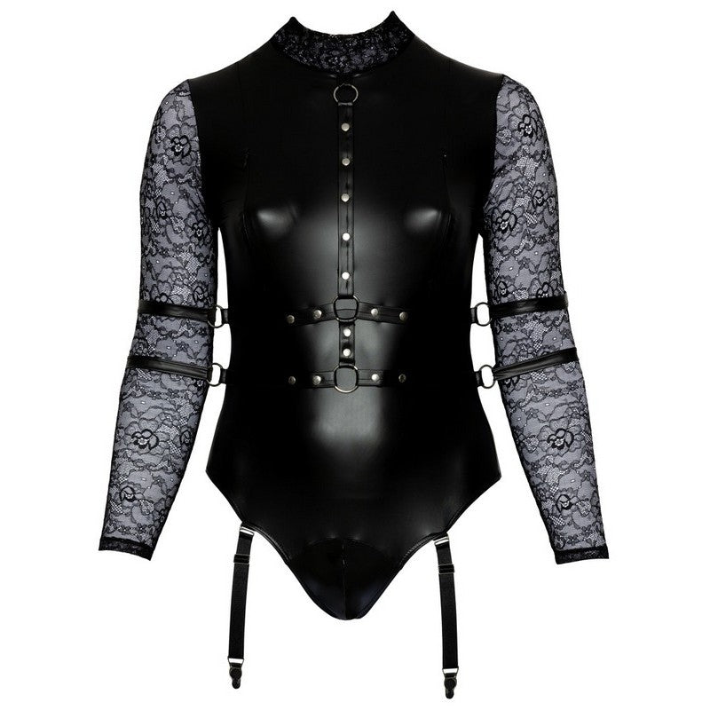 Il body estremamente dettagliato di Cottelli BONDAGE PLUS è realizzato in materiale liscio dall'aspetto opaco e ha maniche lunghe in pizzo e un colletto rialzato con un anello sul davanti. La parte anteriore del corpo è in stile imbracatura con spalline regolabili e sul retro è presente una lunga cerniera. Le due cerniere sul seno e la cerniera sul cavallo possono essere aperte rapidamente per rapporti sessuali spontanei. Le 4 restrizioni garantiscono accattivanti momenti di piacere. Sono dotati di catenelle con moschettone e possono essere fissati agli anelli su entrambi i lati della cinghia in vita. Le cinture con chiusure a strappo possono essere regolate e sono facili da indossare. I 2 reggicalze regolabili nella parte anteriore possono essere rimossi dalla parte degli slip.